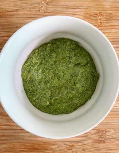 Originally ‘pesto’ comes from the the Italian word ‘pestare’ which means ‘to crush or pound.’ Traditional pesto is a blend of fresh basil, garlic, pine nuts, extra-virgin olive oil, and Parmesan cheese and is pounded in Mortar and pastel. But, with the use of food processor, it comes together in just a few steps.