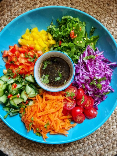 Assemble the Salad ingredients in a large bowl and place veggies separately as shown in the picture to make it more appealing. Now drizzle with the dressing and chopped coriander and Thai red chilli, give it a gentle toss to make sure all the veggies are evenly coated with the dressing. Serve fresh.
