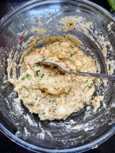 ▪️ In a bowl, add the mashed potatoes and rest of the ingredients. Mix it well with a spoon. Cover and let it rest in the refrigerator for 15 to 20 minutes.
