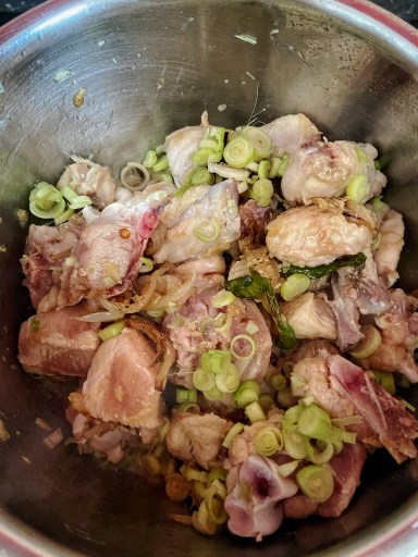 Heat the coconut oil in a pot or a deep pan, add the sliced onions and green chilies, stir until golden brown. Add the grated ginger and garlic & chopped lemongrass, stir well. Now add the chicken pieces along with the ground coriander, turmeric powder and whole spices of star anise and cinnamon. Sear the chicken in medium flame for few minutes until chicken releases its own water and becomes dry.