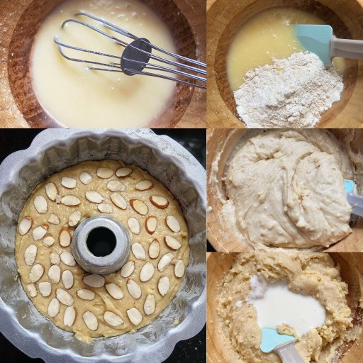 Now strategically place the sliced or slivered almonds on top of the cake batter. Make sure to drizzle a bit of flour on the sliced almonds before adding on the cake batter. This’ll prevent the almond not to sink in the bottom while baking.