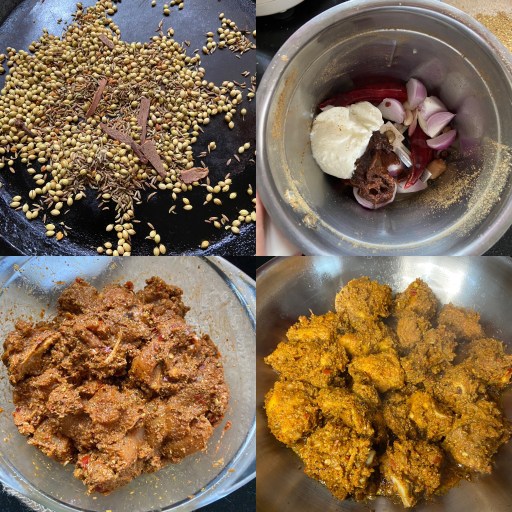 ▪️ Heat a pan and dry roast the whole spices of cumin, coriander, fennel, fenugreek, cinnamon, cloves and peppercorns for 2 to 4 minutes in medium flame. Transfer to a plate and let it cool.
