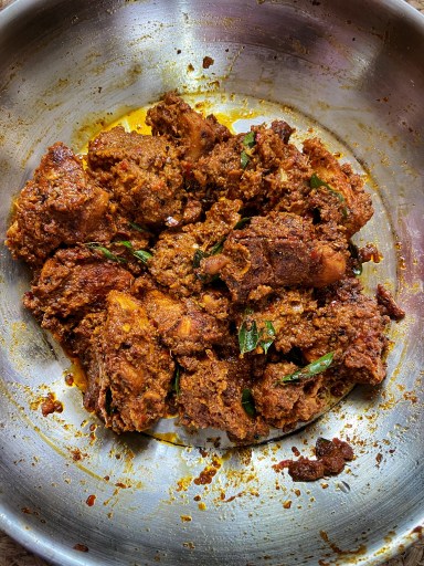 ▪️Now add the fried chicken pieces back into the pan. Sprinkle few curry leaves. Stir and mix it until all the chicken pieces are coated well with the masala.