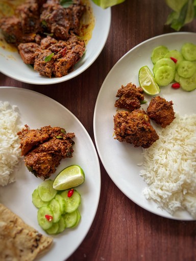Chicken Ghee Roast is a Mangalorean Cuisine and is prepared with freshly ground spices, ghee and the typical red colour of the dish is from the Byadgi chillies which gives the heat as well as the colour. However if you don’t have the Byadyi chillies, worry not, you can use any dry red chillies and substitute with Kashmiri Chilli Powder to get the maximum red colour.
