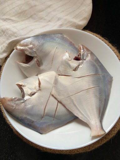 Pomfret is my favourite among the sea fish because of its delicate taste and subtle no-fishy flavour. There’s no denying that my son also loves it and calls it a diamond shape fish.