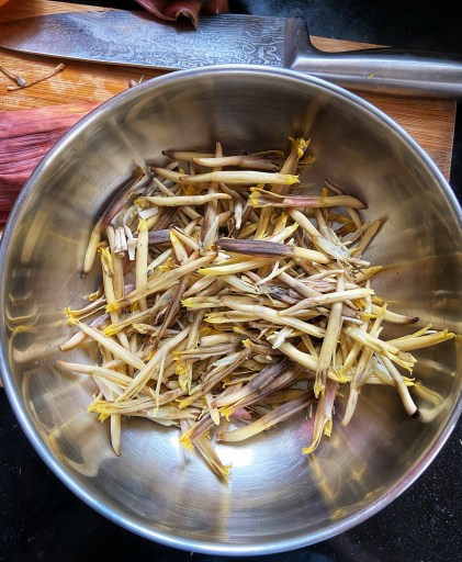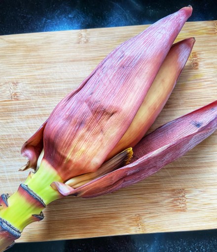 The blanched banana flower is ready to use for dish like curries, fritters and stir fries.