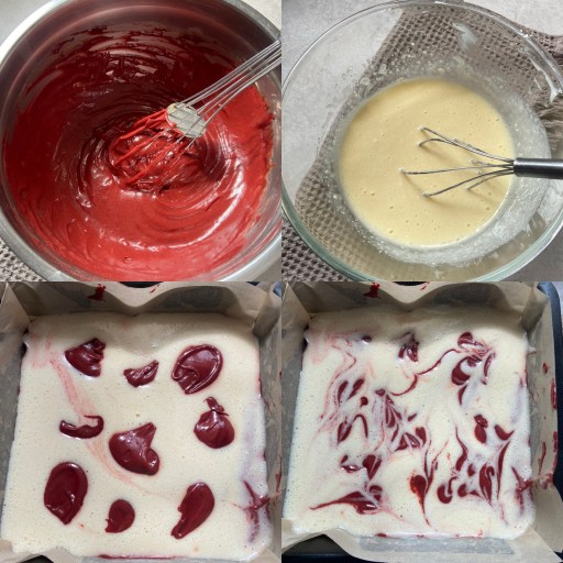 - Add dollop of reserved red velvet brownie batter over the cream cheese layer. Use a toothpick or knife to swirl the cheesecake together with the dollops of red velvet batter. Don’t overdo the swirl.