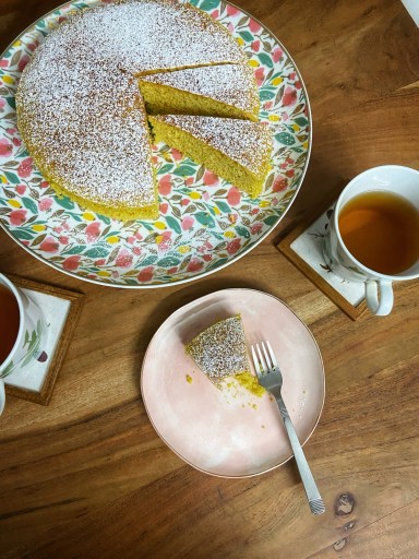 The crumb is moist yet slightly grainy, making each bite unique. It’s not overly sweet, which makes it perfect for pairing with a cup of tea or coffee. The light dusting of icing sugar adds just the right amount of sweetness and makes it look beautiful on the table.
