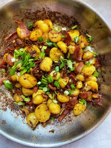 If you love crispy potatoes and the smoky, savoury taste of bacon, this recipe is a match made in heaven. These Pan-fried baby potatoes with Crispy Bacon are golden on the outside, soft on the inside, and packed with flavour from caramelized onions, garlic, and a sprinkle of fresh spring onions.